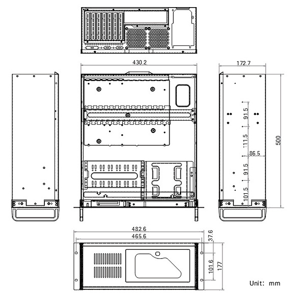| 外形尺寸 | 4U 机箱,430.2 mm × 500 mm × 172.7 mm(L*W*H) |