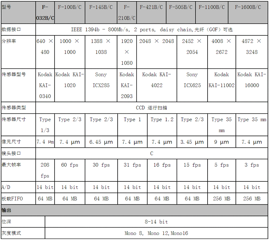 产品特点: 可提供多种类型的芯片:CMOS和CCD,包括近红外增强版 德国Allied Vision Technologies公司(AVT)拥有20年行业经验和先进的摄像机专业制造技术,专注于开发和生产FireWire工业相机。 AVT摄像机为您提供多样的传感器和不同水平的分辨率。 黑白,彩色,高分辨率,高帧率,总有一款适合您!